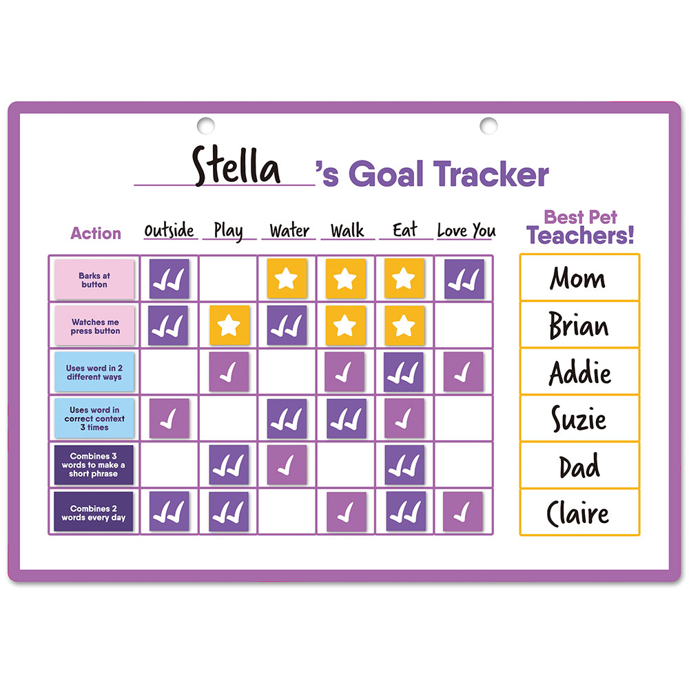 Da seguimiento al progreso de comunicación de tu perro mientras aprenden a usar los botones de habla para mascotas tal como Stella, ¡el primer perro parlante del mundo! Creado por la terapeuta de habla y creadora del movimiento perro parlante Christina Hunger, el Talking Pet Seguimiento de Objetivos de Hunger for Words logra que el seguimiento del aprendizaje de tu perro sea tan fácil como colocar un imán en un cuadro. Con la ayuda de los consejos de expertos escritos por la misma Christina, aprenderás a monitorear el progreso de tu mascota inteligente en tres etapas de comunicación diferentes, a medida que avanzan del nivel principiante a uso avanzado de sus botones parlantes para mascotas, usa los imanes del juego, los stickers personalizables y la superficie de escritura y borrado para actualizar su trabajo. La sección “Best Pet Teacher” de este juguete de mascota interactivo incluso ayuda a que toda la familia participe en la travesía de comunicación de tu mascota mientras das seguimiento a quién enseña más palabras a tu perro a través de juegos de obediencia y adiestramiento canino. Y recuerda: ¡el aprendizaje toma tiempo! Para obtener mejores resultados, ¡practica con tu perro cada día, sigue las actividades de adiestramiento y procura divertirte con tu perro en el proceso!